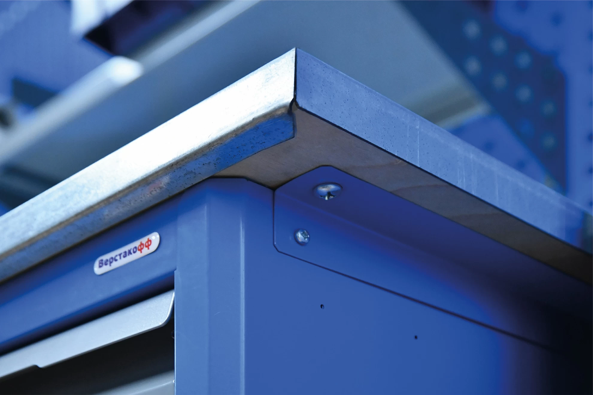 - Верстак состоит из прочной двухслойной столешницы, поддерживаемой двумя тумбами из профилированной холоднокатаной стали, и полки-стенки.
